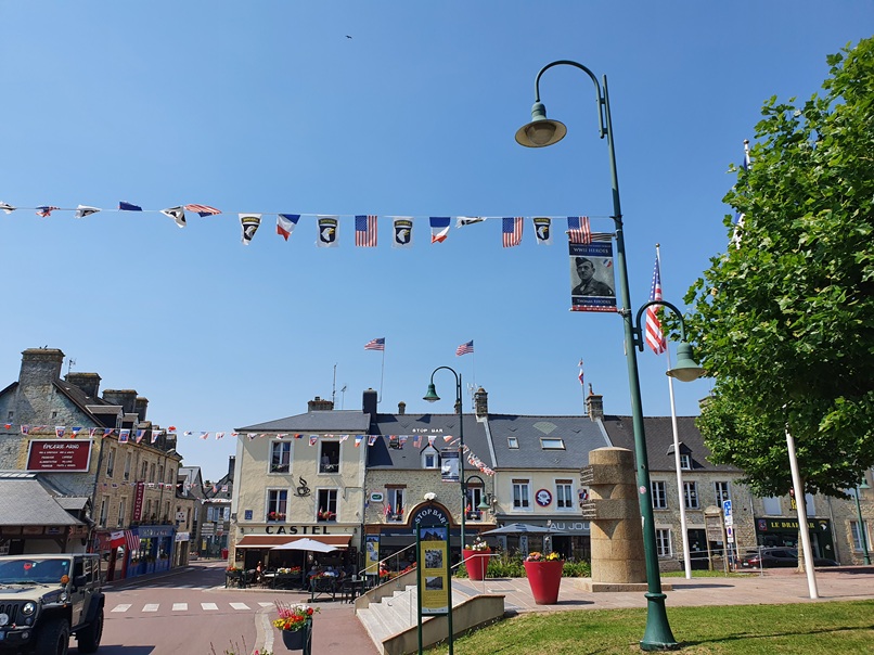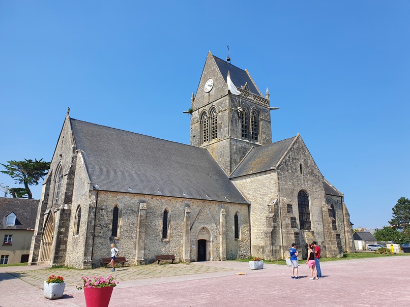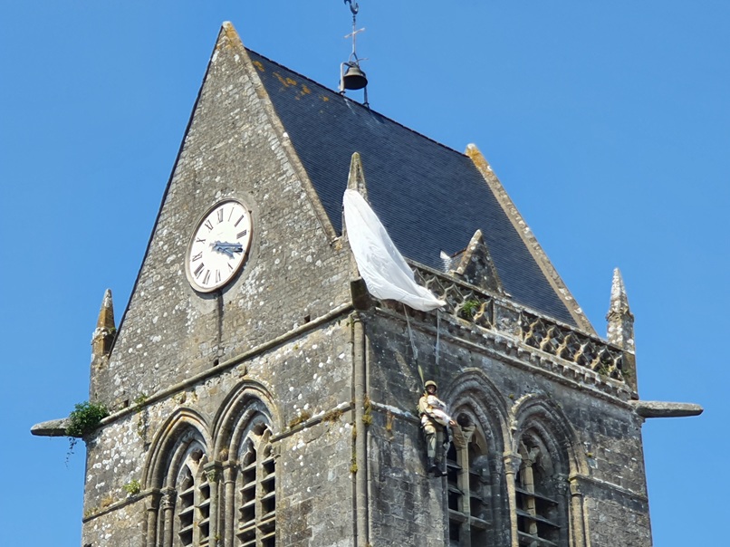 Sainte-Mère-Eglise ist ein Touristenmagnet als in dem Film „Der längste Tag“ die Geschichte des US–Fallschirmjäger Private John Marvin Steele erzählt wurde. Sein Fallschirm hatte sich im Kirchturm verfangen und er hing dort mehre Stunden in luftiger Höhe. Offensichtlich hängt er da immer noch, allerdings hat er mittlerweile einen neuen Fallschirm bekommen: der ursprünglich grüne wurde gegen einen weißen ausgetauscht.