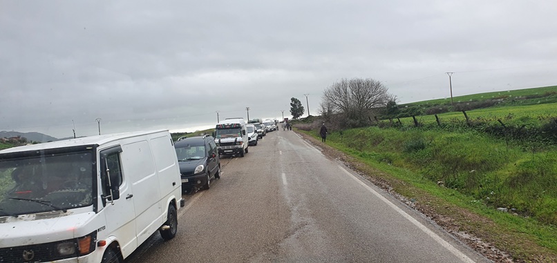 bild li, 100m zuvor: die Polizei hatte die Straße gesperrt, winkend hatten mich die Marokkaner daruf aufmerksam gemacht, als ich an der Schlange vorbei fuhr. Die königliche Polizei betrachtet mein Auto und winkt mich durch! Ich durfte passieren.