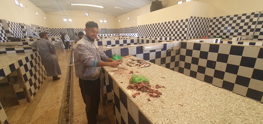 Plötzlich bin ich von den Jugentlichen umringt, jeder spricht auf mich ein: ‚Woher kommst du, wie heißt du, wie gefällt dir die Stadt?‘ Es ist ein Durcheinand aus Arabisch, Englisch, ein paar Brocken Deutsch. ‚Ich hätte gerne diesen Fisch‘. Einer von den Jugendlichen frägt, ob er den Fisch für mich ausnehmen und putzen soll!? ‚Ja gerne‘, in der Zwischenzeit ich bezahl den Fisch. Der Fischputzer kommt zurück und will 5dh. Ich dachte, daß der Service im Kaufpreis enthalten is und verweis ihn an den Händler, bei dem ich den Fisch bezahlt hab. Ich verzieh mich mit meinem Kauf an den Rand der Halle und beobachte das Treiben. Ein Marokkaner kommt, kauft Fisch, läßt ihn auch ausnehmen und entschuppen, gibt dem Fischputzer eine Münze. Mir dämmerts, daß sich die Jungs hier ihr „Taschengeld“ verdienen und eben nicht von den Fischhändlern bezahlt werden. Im gleichen Moment hilft ein Fischputzer eine Kiste Fisch zum Auto des Käufers zu tragen, als Lohn bekommt er einen Fisch. Weiter seh ich, daß sich die Fischputzer einge Teile der Innereien in eine Tüte packen. Jetzt wirds mir klar, wies läuft. Das bieg ich wieder gerade.