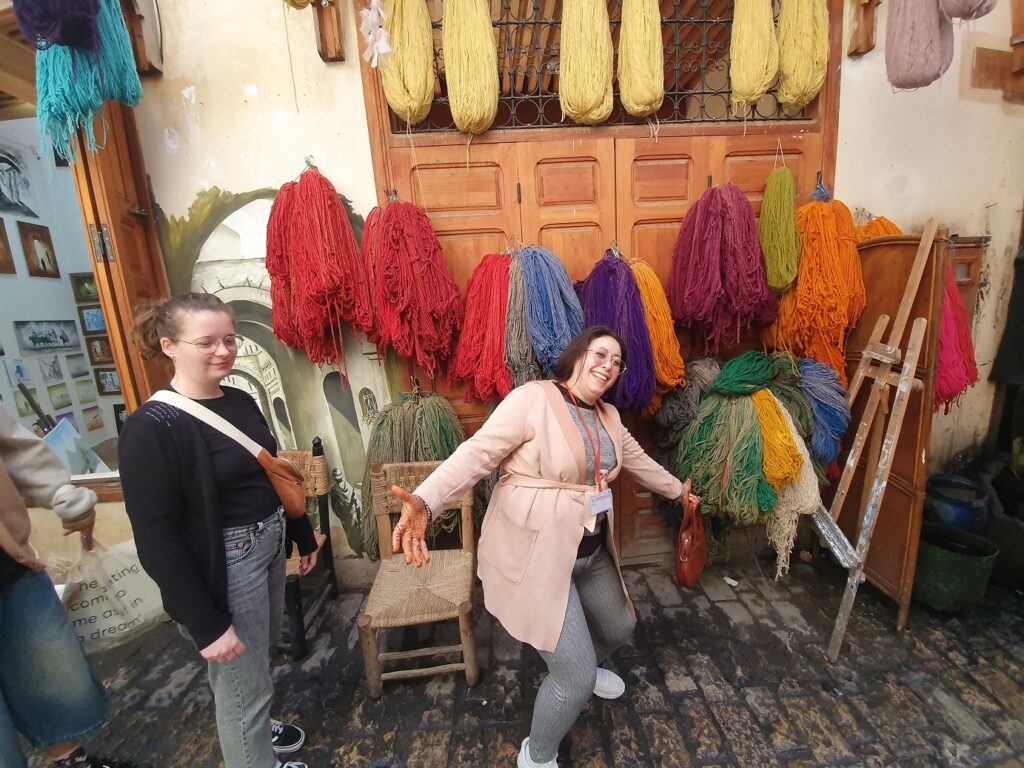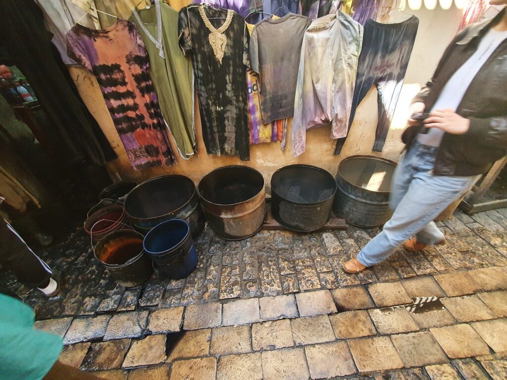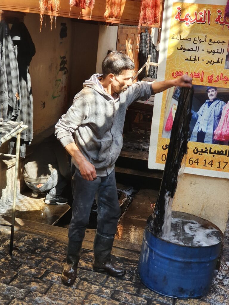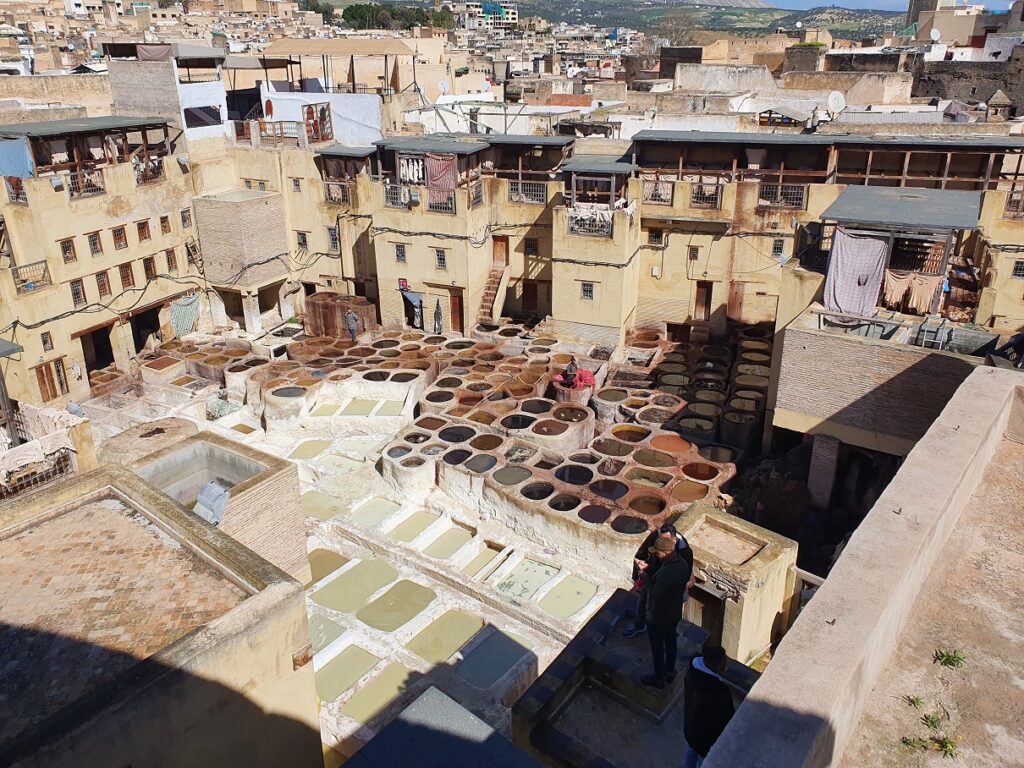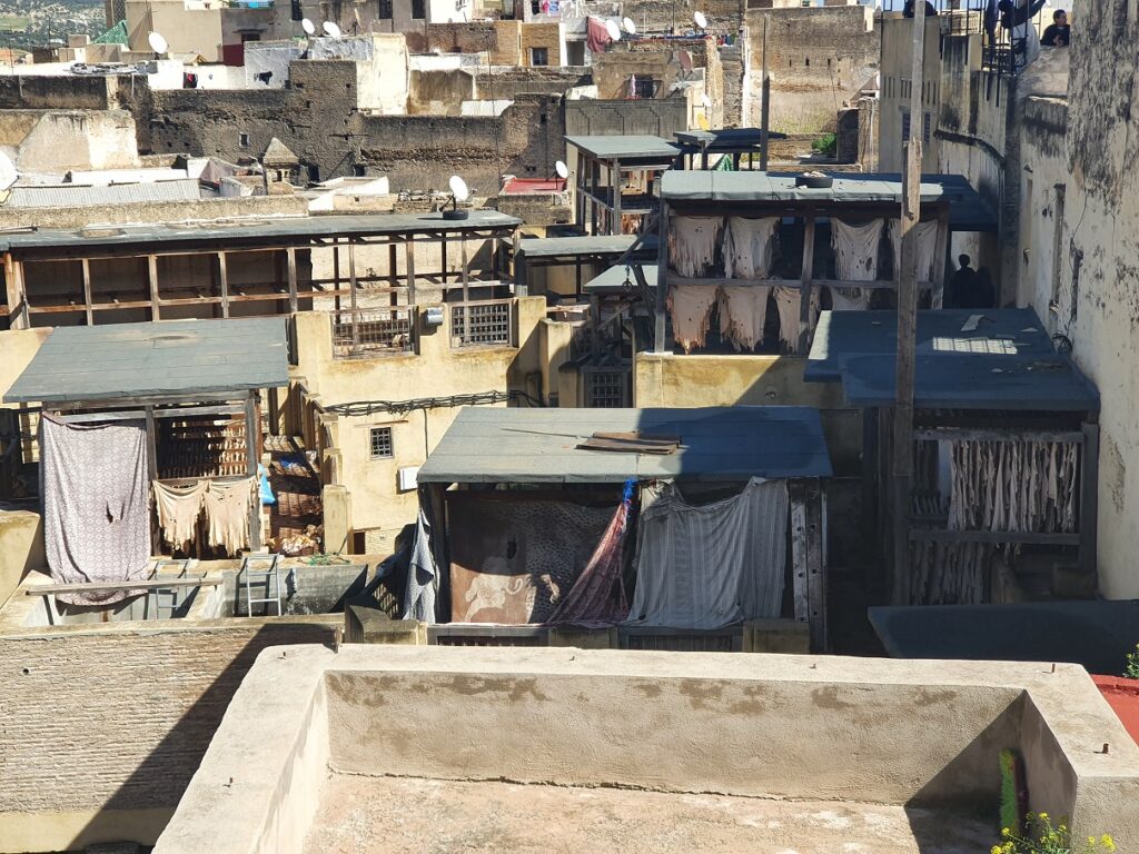 Die Gerberei: verarbeitet werden Häute von Schafen, Ziegen, Rindern und Dromedaren, ca. 200 Häute pro Tag, die teilweise nach Italien exportiert werden, das Meiste wird in der Medina zu Taschen, Sitzkissen, Jacken, Gürtel u.a. verarbeitet. Gegerbt wird mit Taubenscheiße, der den Amoniak liefert, gefärbt zur mit aus der Natur gewonnen Farben.