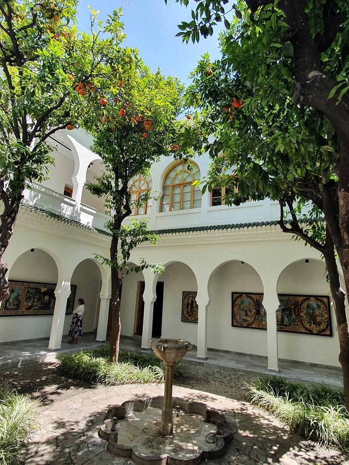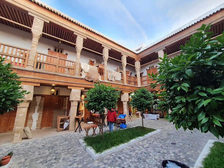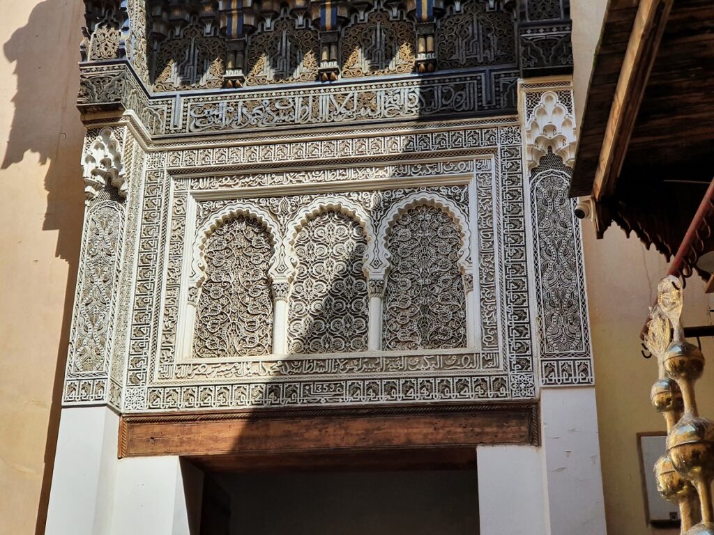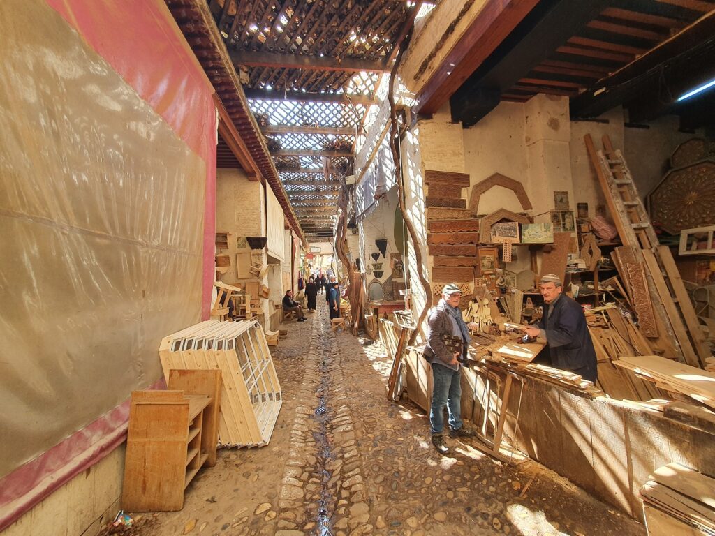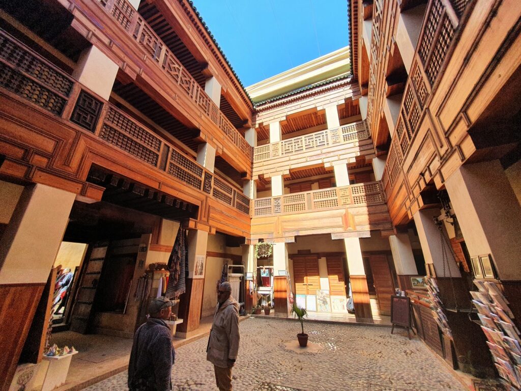 Die prachtvollen Innenhöfe, so genannte Rijads, sind mit uralten Mosaiken und aufwendigen Holzschnitzereien verziert, die Brunnen dienen nicht nur der Versorgung sondern auch zur Kühlung, gerade im Sommer, wenn die Temperaturen auf über 40° steigen.