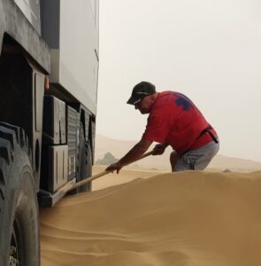 Also wir die Schaufeln raus und erst mal soweit wie möglich alles frei gemacht. Dank „Murphys Law“ wurd der Wind immer stärker – Lernerfolg: Sonnenbrillen helfen auch gegen fliegenden Sand. Ein Marokkaner kam auf seinem Moped, hat sich neben uns in den Sand gesetzt, zugeschaut, hat seine Hilfe angeboten und mit den Händen gegraben.