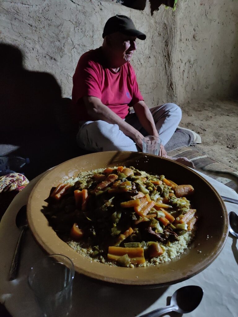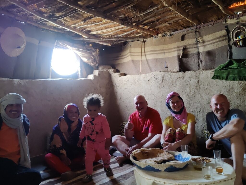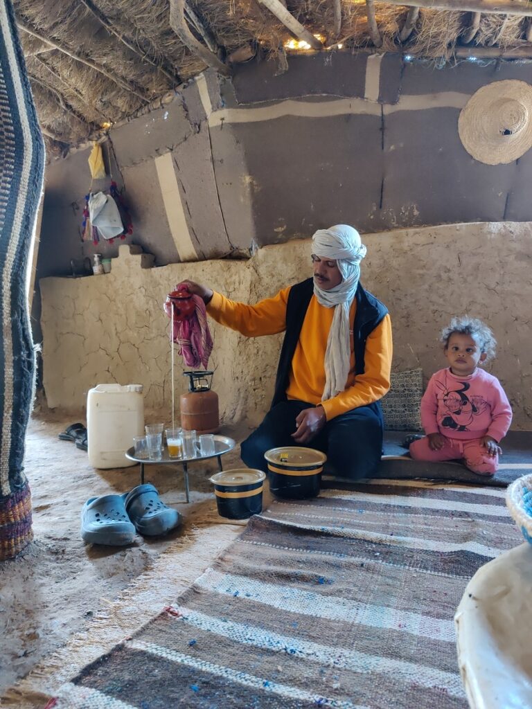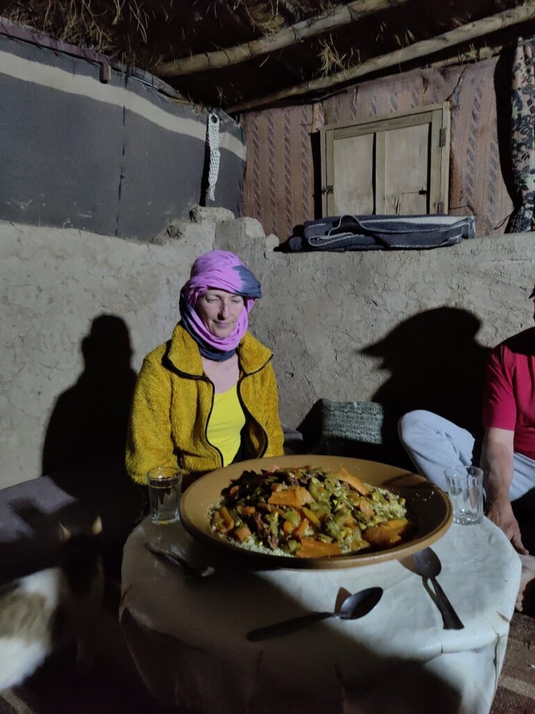 Auf der Roomtour zeigte er uns sein Haus: die Küche, die Speisekammer, das Schlafzimmer, die Außenküche und den Lagerraum fürs Futter seine 40 Schafe und Ziegen. Neben seinem Haus hat er ein Zelt aufgebaut, denn oft kommen Touristen auf dem Kamel, von Merzouga 3h quer durch den Erg Chebbi, angeritten, um im Zelt in der Wüste zu übernachten.