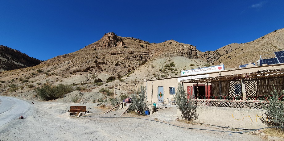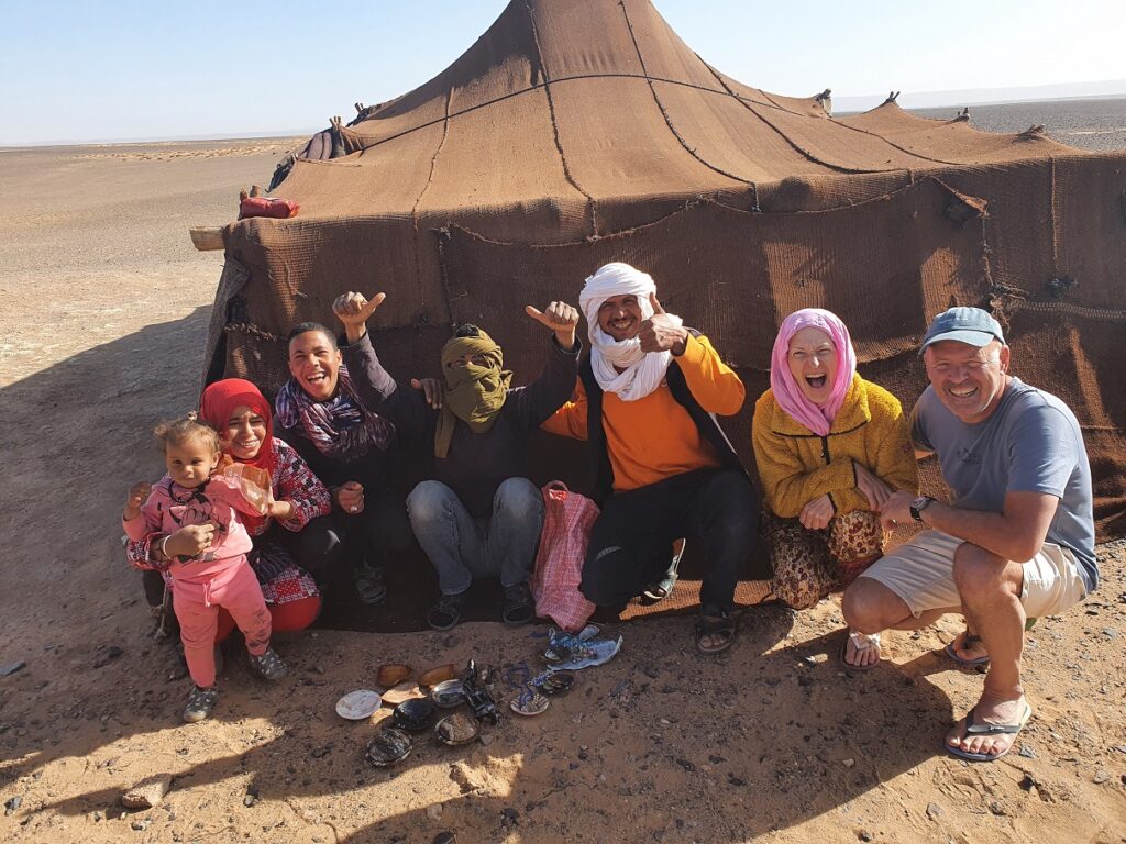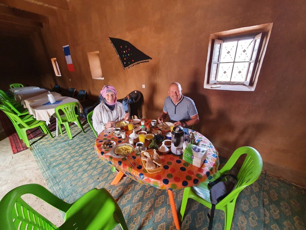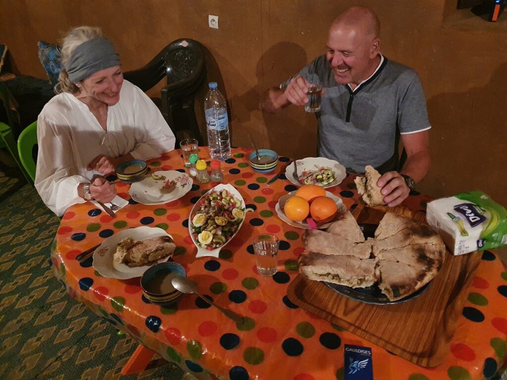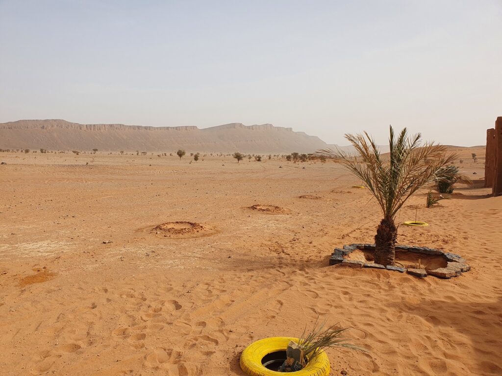 Auf der Roomtour zeigte er uns sein Haus: die Küche, die Speisekammer, das Schlafzimmer, die Außenküche und den Lagerraum fürs Futter seine 40 Schafe und Ziegen. Neben seinem Haus hat er ein Zelt aufgebaut, denn oft kommen Touristen auf dem Kamel, von Merzouga 3h quer durch den Erg Chebbi, angeritten, um im Zelt in der Wüste zu übernachten.
