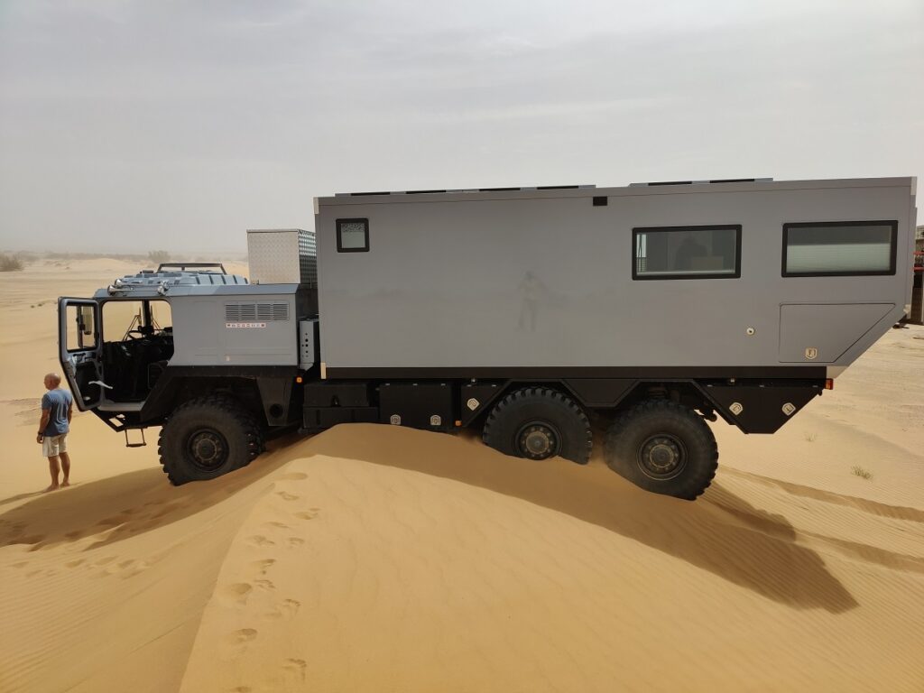 Natürlich wird man im Lauf der Zeit immer mutiger und so kam es, wie es kommen mußte, Frank hat sich oben aufm Dünenkamm mit seinem 19t LKW festgefahren und lag mitm Unterboden auf. Sowas passiert hat, wenn Jungs spielen gehen!