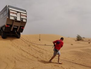 Wir wollten den Koloss rückwärts von der Düne ziehen und das Ganze mit der Winde machen, incl. Umlenkrolle, wozu hab ich mir das Ding denn sonst einbauen lassen! Das Seil war noch nicht mal richtig straff, da is der KAT schon fast freiwillig vom Dünenkamm runter. 2 Greenhorns im 1. Versuch – yes! Nach ca. 1h war alles erledigt, davon haben Auf- und Abbau länger gedauert, wie der eigentlich spannende Teil. Allerdings wäre es besser gewesen, an den Fahrzeugen die Fenster, trotz Hitze, geschlossen zu halten: die Folge, es war überall Sand in der Kabine!