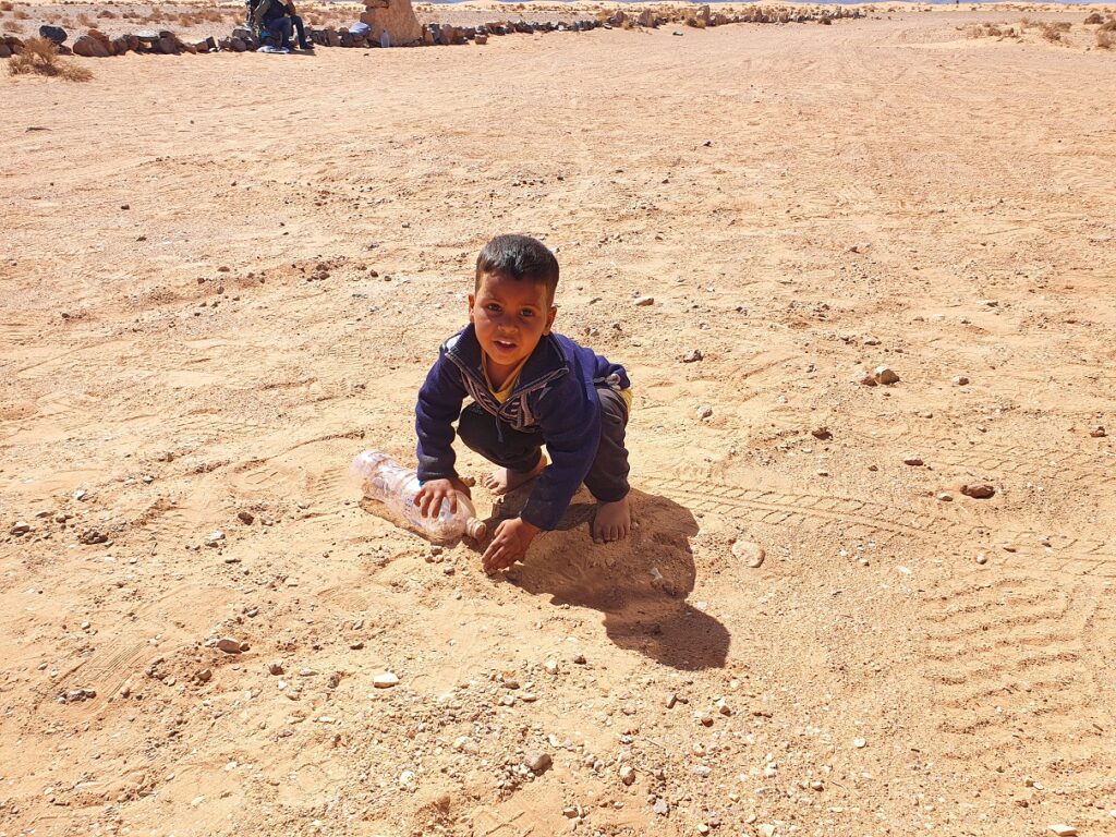 Während ich ein paar Fotos von der Himmelstreppe mache taucht plötzlich ein 2. Marokkaner mit einem kleinen Kind auf. Der Kleine stürmt auf mich zu und fängt auf arabisch ganz aufgeregt an, irgendwas zu erzählen – es war definitiv kein betteln. Ich hab dem Jungen dann erklärt, daß ich keine arabisch verstehe. Der Vater kommt hinzu und erklärt mir auf englisch, daß der Junge mich gefragt hat, ob ich eine Plastikflasche hätte, damit er damit spielen könne. Ich gab dem Jungen die leere Trinkwasserflasche, die ich noch im Fahrerhaus hatte. Der Junge schraubt den Deckel der Flasche ab, gibt ihn mir zurück und beginnt sofort, Sand in die Flasche einzufüllen. Ich: Soll ma den Flaschenhals abschneiden? Der Vater nickt. Ich hab den Flaschenhals abgeschnitten, den Deckel wieder aufgeschraubt und mit dem kleinen Plastikteil Sand in die Flasche gefüllt. Der Junge spielt sofort damit weiter.