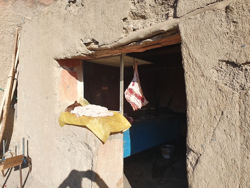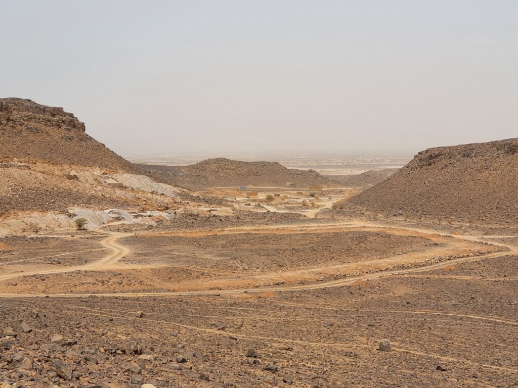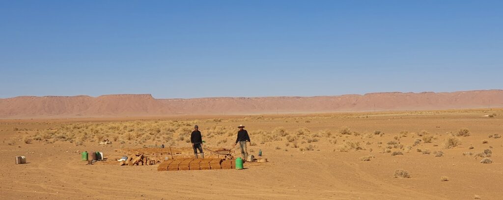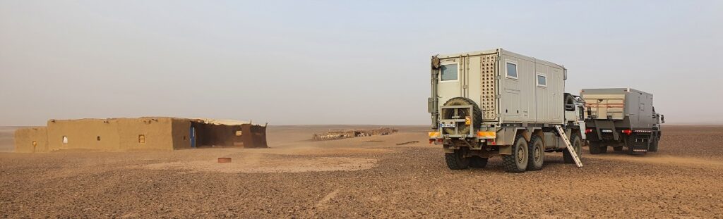 „Wollt ihr wirklich heut noch weiterfahren, es ist schon spät. Ihr könnt hier parken und im Auto schlafen, ich lade euch zum Abendessen ein.“ So saßen wir, geschützt vom Wind, in seinem aus Lehm gebauten Haus im Aufenthaltsraum, der einzige Raum mit Licht über Solar und Batterie gespeist. Wir haben beim Tiere füttern geholfen und dabei erfahren, daß der Grundwasserspiegel immer weiter sinkt und der Brunnen sich nicht mehr tiefer graben läßt. Der letzte Regen ist vor 6 Jahren gefallen.