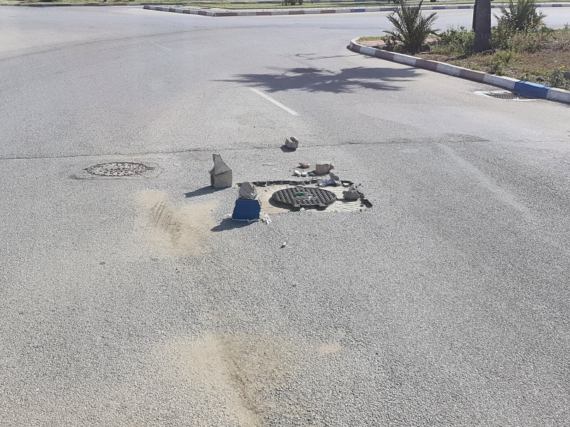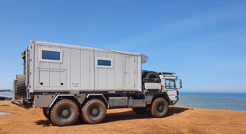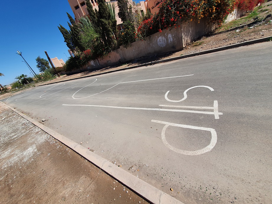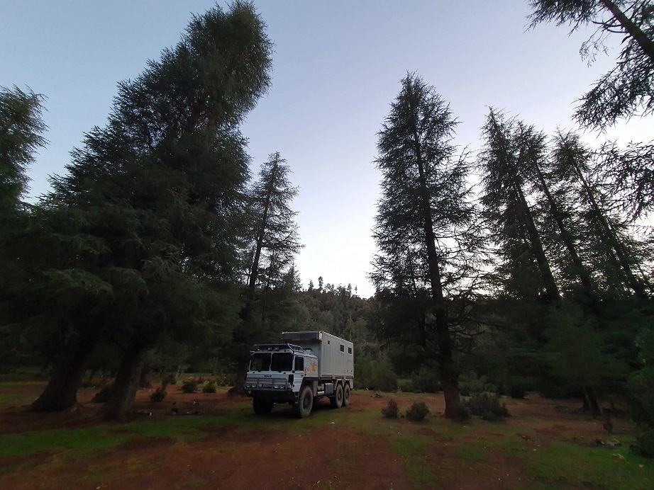 Tatsächlich kletterte gerade ein junger Mann über die Kardanwelle und wollte sich im Rahmenzwischenraum im Bereich der 2. und 3. Achse verstecken. Ich hab im zugerufen, er solle verschwinden und hab mit dem nassen Putzlumpen nach ihm geschlagen. Als er unterm Auto herausgekrochen ist, habe ihn gestellt und ihm gesagt, daß wir jetzt zur Polizei gehen. So schnell hab ich selten jemanden laufen sehen und er war, wie beabsichtigt, dauerhaft verschwunden. Der junge Mann hat wohl gedacht, wir sind auf dem Weg Richtung Norden zur Grenze nach Ceuta, Spanien. In Wirklichkeit wollten wir aber 50km Richtung Süden fahren. Nicht auszudenken, was passiert wäre, wenn er sich auf dieser Strecke nicht mehr hätte halten können.
