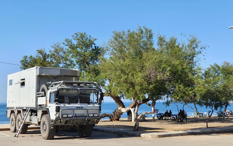 ‚Ob ich sonst noch was brauch, ob ich alles hab, Wasser gibts da drüben, der Wachmann ist die ganze Nacht hier, ich kann morgen losfahren wann ich will.‘ Ich hab mich noch ein bißchen mit dem Wachmann unterhalten. Ein LKW-Fahrer, der auch dort parkte, wollt mir unbedingt seinen 7,5t Tanklaster zeigen, mit dem er den Ort mit Wasser versorgt, also hab sein Auto noch ein bisschen gelobt. Die Nacht verlief ruhig und hab am nächsten Morgen mein Auto unfallfrei wieder aus dem Hof rangiert.