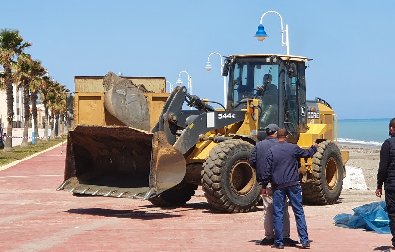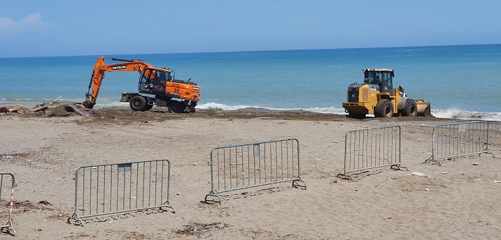 Der große Radlader schafft die Einzelteile vom Strand…