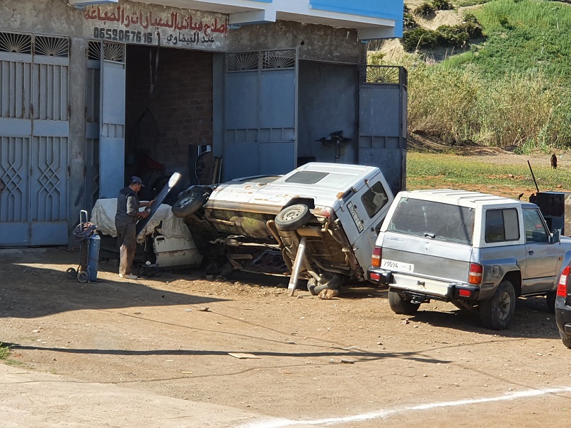 In Marokko hab ich mich mit Mike und Heidi getroffen. Wir waren in Fnideq, ca. 5km von der Grenze nach Ceuta, Spanien, die Autos nebeneinander abgestellt auf einem „bewachten“ Parkplatz im Ort. Nach einem Stadtrundgang kommen wir zurück zu den Autos, ich steig gerade in die Kabine, da ruft Heidi: Bernhard, da is einer unter deinem Auto!