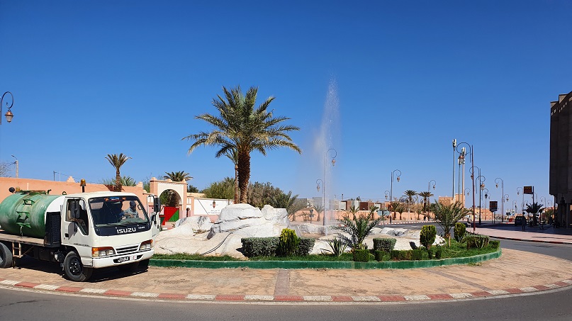 Sie haben mich an eine Tankstelle eskortiert, ‚hier kann ich bleiben, hier is es sicher‘, ich soll mich da an den Rand hinstellen. Der eine geht zum Tankstellenbesitzer und erklärt ihm die Sitiuation – der ist gar nicht amused! Er kommt zurück, ’nein hier kann ich doch nicht bleiben, wir bringen dich in den Hof von der Gemeindeverwaltung.‘ Das war dann mitten im Ort, auf der Straße war das ganze Dorf unterwegs, leiten die mich in einen kleinen umzäunten Bereich, durch ein mit marokkanischen Flaggen dekoriertes Tor, 3 Stellplätze für PKW und dann komm ich mit meiner Wuchtbrumme, die grad so durchs Tor paßt, ohne die Flaggen zu ramponieren.