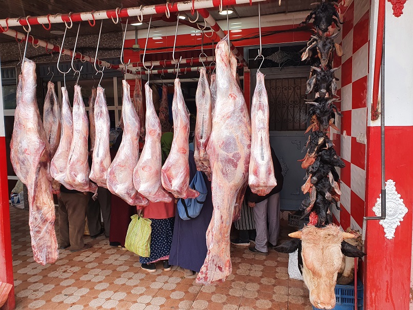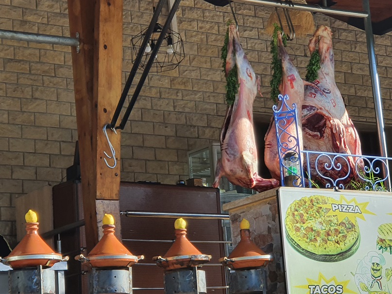 Der Metzger schneidet das Fleisch von der Rinderkeule, die da so lustig im Restaurant vor sich hinbaumelt, drehts durch den Wolf, wiegt die bestellten 300g ab, würzt das mit Zwiebel, Peterilie und Salz, der Grillmeister formt es mit der Hand zu so Würstln und grillt des dann. Serviert wirds dann mit gegrillter Tomate und Zwiebel, 1 Flasche Wasser, marokkanischer Minztee und ein ½ Fladenbrot.