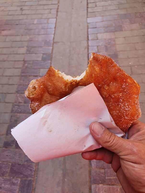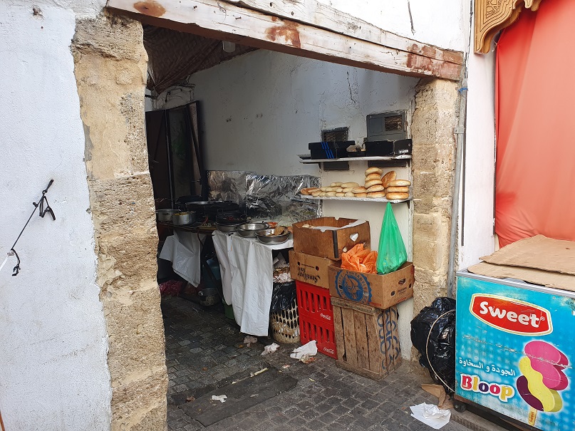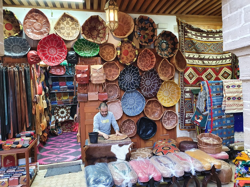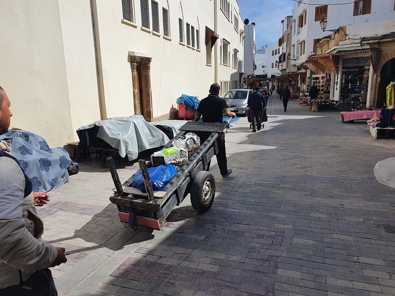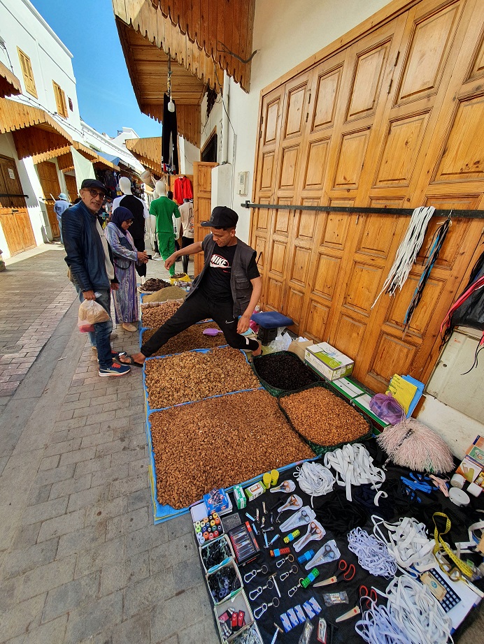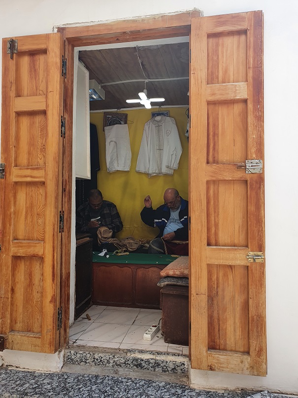 Der Hosengürtel brauchte noch 3 zusätzliche Löcher. Ich bin in eines der Geschäfte gegangen, das Stoffe verkauft hat um den Besitzer zu fragen, ob er das machen könne. Dieser hat sogleich einen anderen Herrn, der gerade marokkanischen Tee ausliefern wollte, herbei gewunken. Der stellt sein Tablett auf den Stufen ab und bringt mich 200m weiter in eine Schneiderei. Ein Locheisen und 3 Schläge später erfüllte mein Gürtel wieder seinen Zweck. Ich hab beide noch gefragt, was ich schuldig bin – man hat mir nur einen schönen Aufenthalt gewunschen!