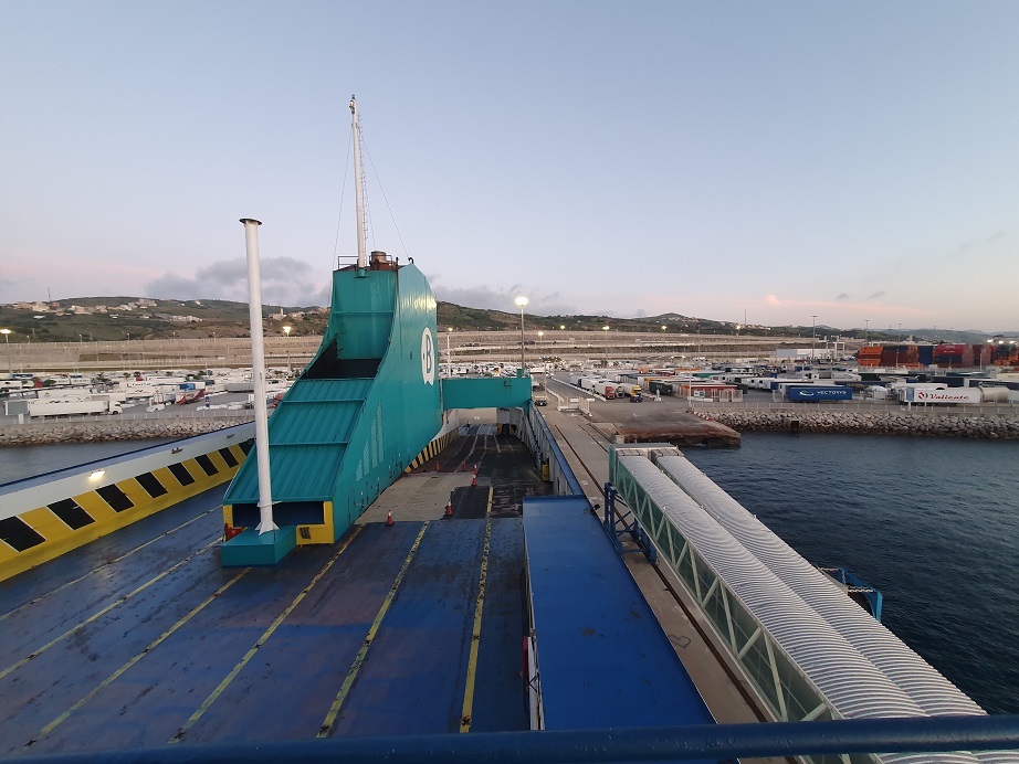 Anreise mit der Fähre von Algeciras nach TangerMed. Auf der Fähre wurden wir gleich aufgefordert, das Einreisedokument (fishe) auszufüllen und der Polizist hat gleich die Paßkontrolle durchgeführt und den Paß gestempelt.
