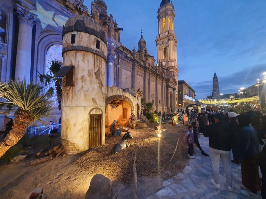 Noch 10 Tage bis Weihnachten, es hat 15°. Auf dem Platz vor der Basilika ist ein Christkindlmarkt aufgebaut. In einem großen Bereich ist das Leben in Bethlehem dargestellt, durch den man in einer großen S-Schleife durchgeschleust wird. Auf dem Markt gibt es Buden, mit den üblichen Weihnachtsartikeln, Getränken und Verpflegungen. In einem etwas zurückgesetzen Innenhof gibt eine Kinderspielecke mit Karusell und Eisenbahn. Eine Eislaufbahn ist in einem großem Zelt mit weiß-blauem Himmel aufgebaut. Ein Chor singt auf spanisch „Stille Nacht, heilige Nacht“. Über uns Besuchern kreist in 100m Höhe ein Polizeihubschrauber und gleichzeitig hört man das dumpfe Grollen der Artilleriegeschütze vom großen NATO-Übungsplatz, 10km nördlich der Stadt.