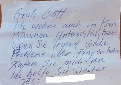 Irgendwann komm ich zurück zum Auto und finde diesen Zettel an der Windschutzscheibe.