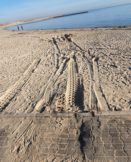 Um 7 Uhr morgens klopft er wieder. Jetzt verstehe ich auch sein Problem. Er hat sich am Strand in Sand festgefahren und frägt, ob ich ihn rausziehen kann. Aber klar doch. Ich fahr über die Strandpromenade auf den Strand, hol nen Gurt ausm Auto und befestige diesem am Schäkel. Er schnappt sich das andere Ende und knotet es am Auto fest. So werd des nix! – erstens hält des ned, zweitens is mir mein Material zu schad und drittens mach des glei gscheid. Also noch einen Schäkel, PKW-Size, rausgekramt und des Auto rückwärts auf die Strandpromenade gezogen. Er wollt komplett raus ausm Sand. Kann ich verstehen, denn es war eine lange und kalte Nacht für ihn.