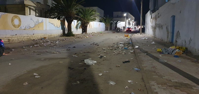 Auf meinem Weg von Douz nach Kairouan komme ich irgendwo durch einen kleinen Ort. Die 2 spurige Straße ist tiefschwarz und 10 Personen versuchen eine schwarze Flüssigkeit mit Wasserschiebern von der Straße zu bekommen.