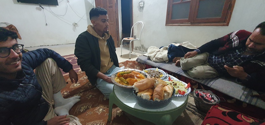 Tags darauf war ich dann bei der Familie von Amin zum Abendessen eingeladen. Es gab aus einer große Schüssel Tomatenspagetti mit Fleischstücken, Salat und Brot und für jeden eine Gabel. Nah dem Foto kamen noch 2 Brüder von Amin zum essen, so daß wir zu 6 um die Schüssel saßen.