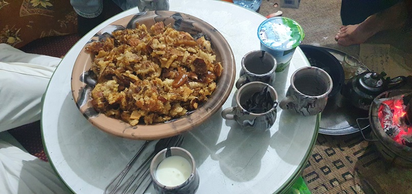 Zum Abendessen war ich am Neujahrstag noch bei Amins Familie eingeladen. Das war der passende Abschluß eines bombastischen Tages. Es gab in Butterschmalz angerößtetes Brot mit viel Zucker und Datteln darin. Dazu Sauermilch. Klasse!